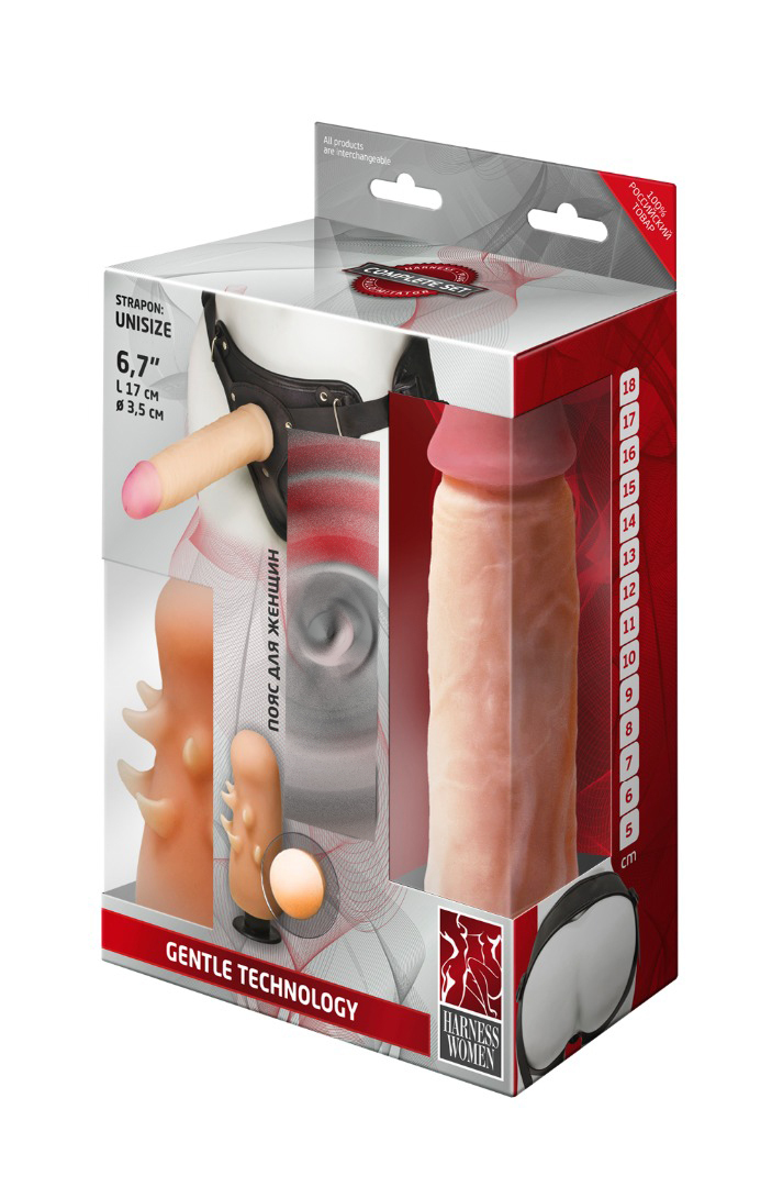 Harness-пояс для женщин. В комплект входят пояс-трусики и две насадки. Трусики легко регулируются по размеру благодаря мягкой внутренней поверхности без швов. Они подходят для любых насадок, которые крепятся с помощью штырьков из набора.