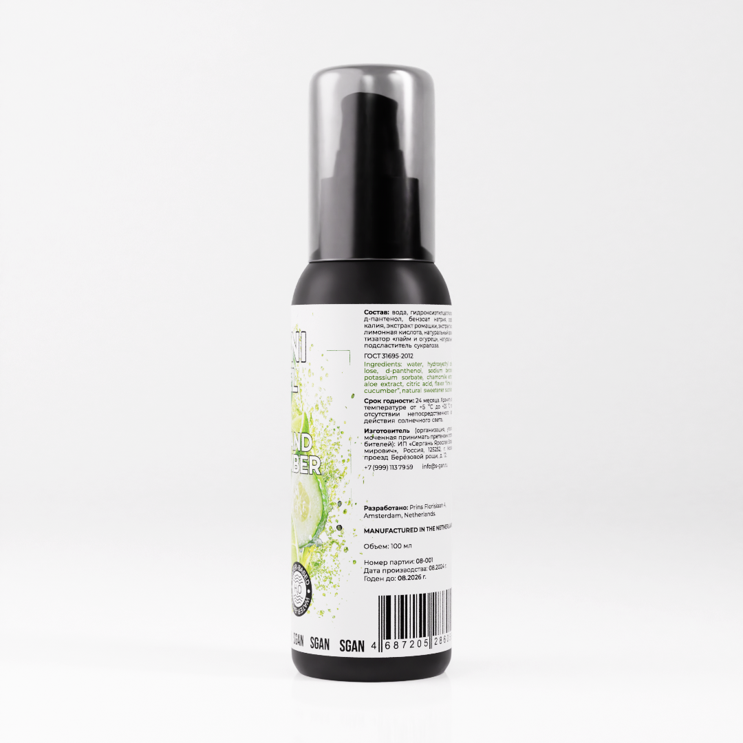 Состав: Вода, гидроксиэтилцеллюлоза, д-пантенол, бензоат натрия, сорбат калия, экстракт ромашки, экстракт алоэ, лимонная кислота, натуральный ароматизатор "Лайм и огурец", натуральный подсластитель (сукралоза).