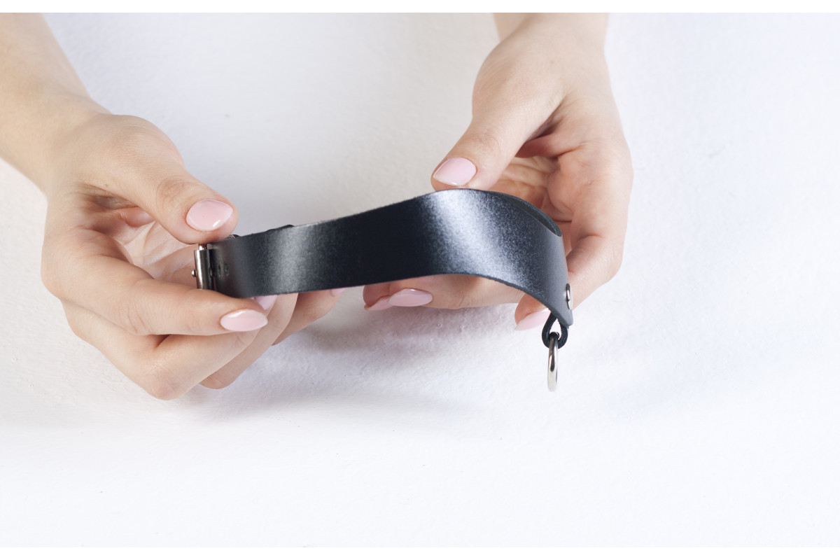 Ошейник стильной формы, единый отрез натуральной кожи и металлическое кольцо для поводка в центре.