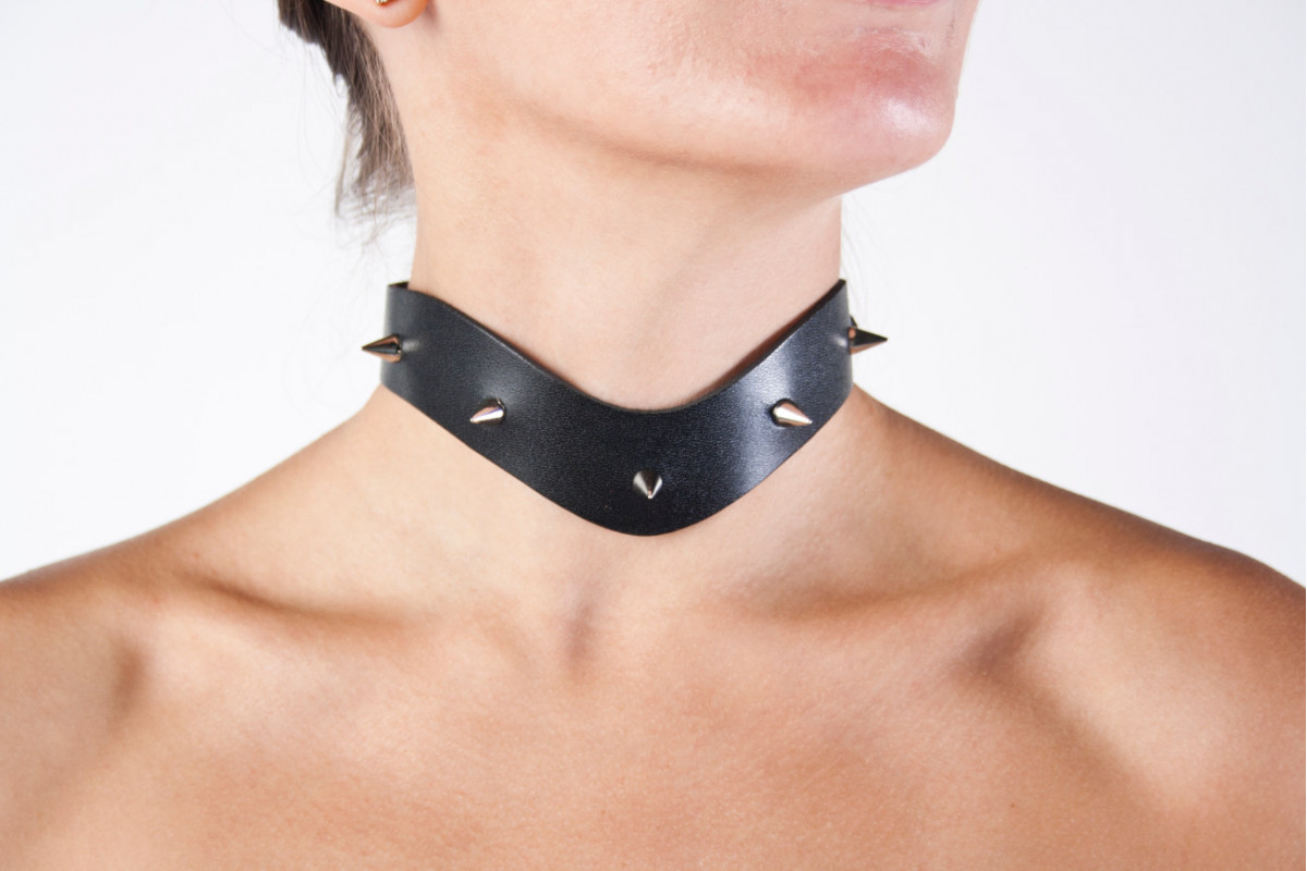 Ошейник стильной формы из черной кожи, единый отрез натуральной кожи и металлическое полукольцо для поводка.