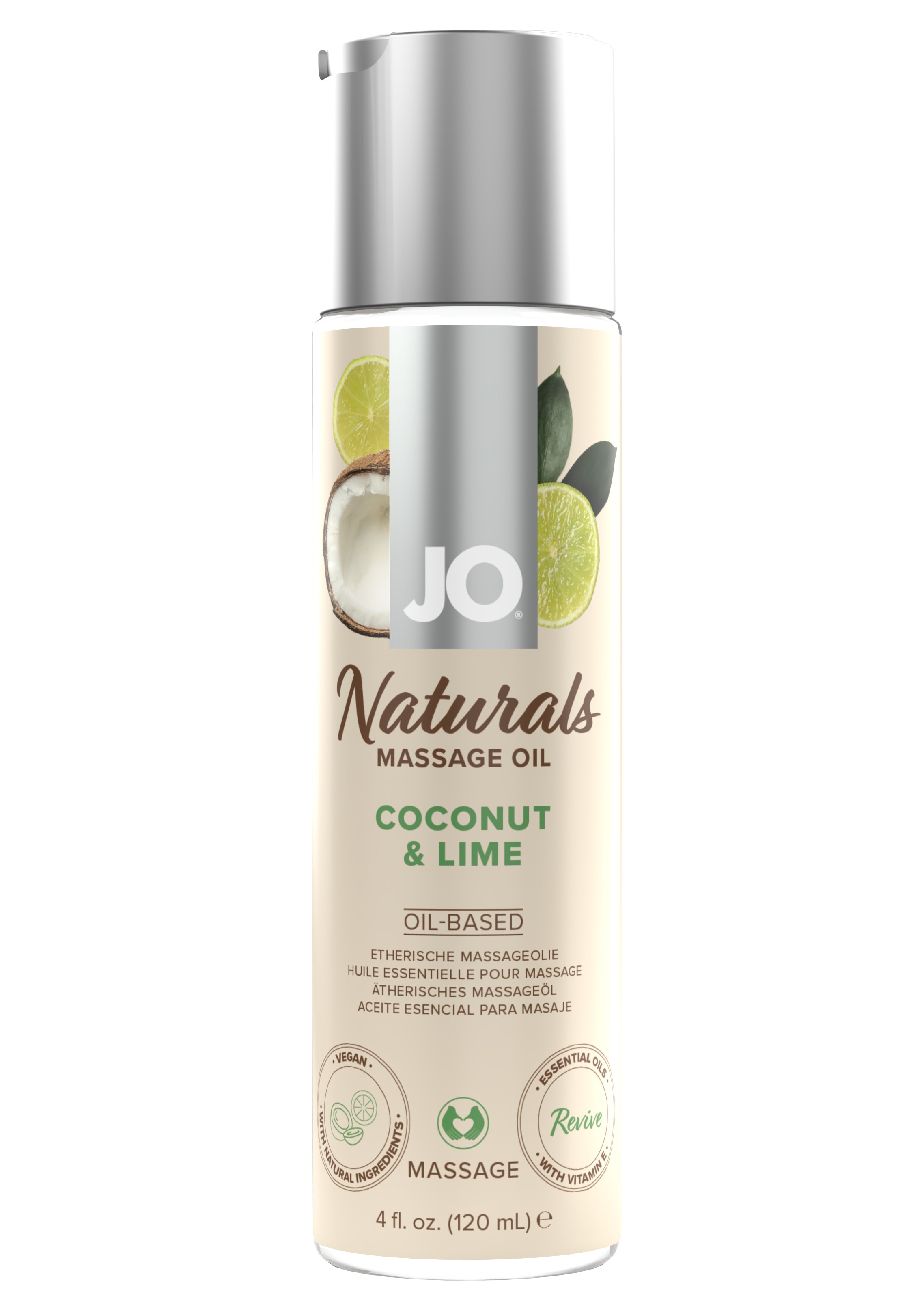 JO NATURALS Massage Oil Coconut & Lime – эфирное масло для массажа на натуральной растительной основе с ярко выраженным ароматом кокоса и лайма. Благодаря тщательно продуманной формуле, масло обеспечивает длительное гладкое скольжение, позволяющее при массаже уберечь кожу от негативного воздействия. Входящие в состав натуральные средства и витамин Е прекрасно увлажняют и питают кожу. Сочетание сладости кокоса и свежей терпкости лайма придаст бодрости, улучшит настроение и создаст игривый настрой. Сочный, яркий, фруктовый аромат создан для тех, кто умеет владеть страстью, но держать зов природы под контролем до нужного момента.