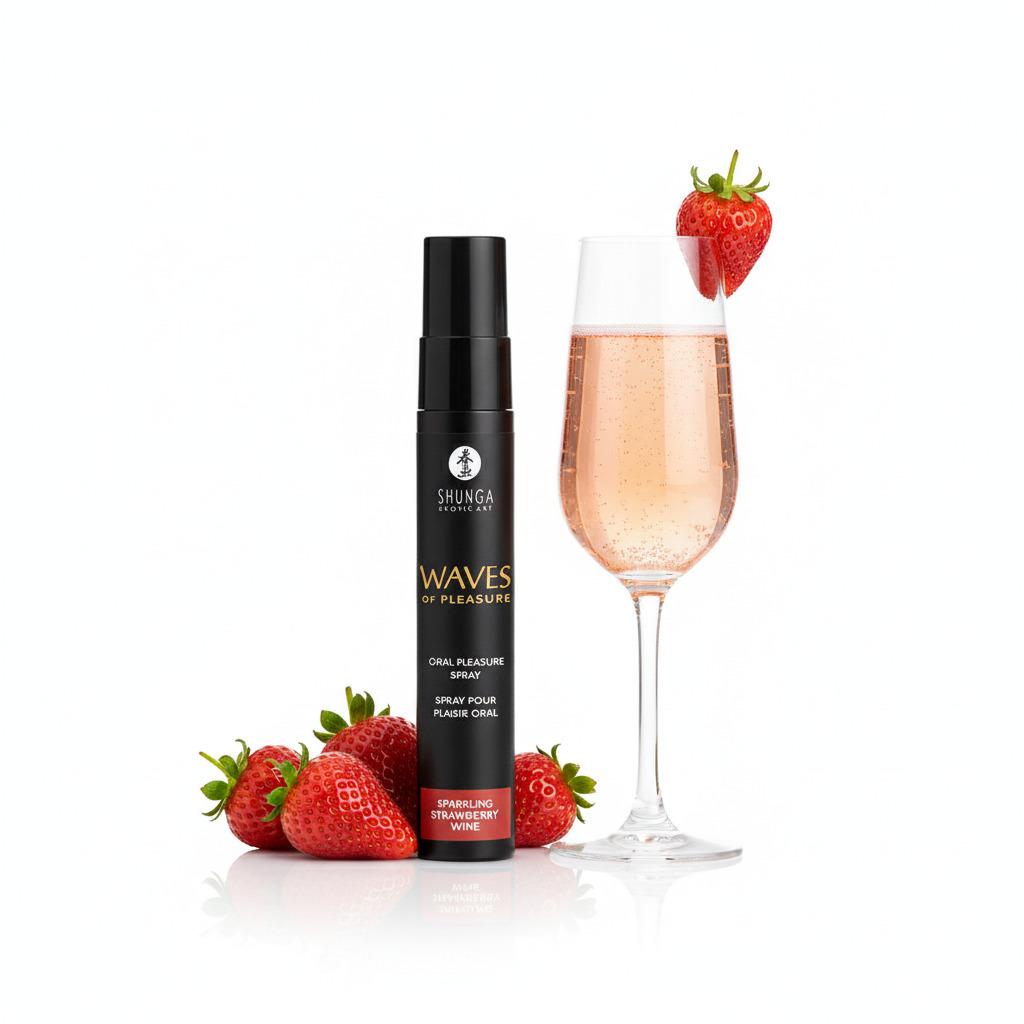 Shunga Waves of Pleasure Sparkling Strawberry Wine – оральный спрей с ароматом клубничного игристого вина. Он увлажняет и делает любые оральные практики более комфортными и чувственными за счёт усиленного слюноотделения. Подходит для поцелуев, лизания и стимуляции эрогенных зон.