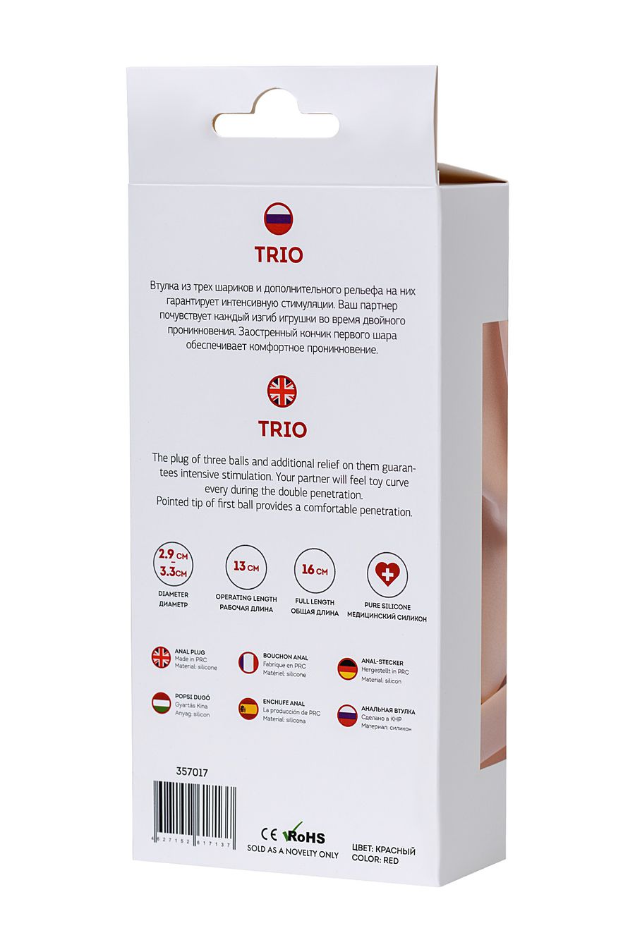 Втулка из трех шариков и дополнительного рельефа на них гарантирует интенсивную стимуляции. Ваш партнер почувствует каждый изгиб игрушки во время двойного проникновения. Заостренный кончик первого шара обеспечивает комфортное проникновение. Рекомендуется использовать смазки на водной основе. Хранить при температуре не выше 35, избегать попадания прямых солнечных лучей. До и после использования промыть теплой водой с мылом. Для дополнительной дезинфекции обработать антибактериальным очистителем для изделий интимного назначения. Общая длина изделия: 16 см Рабочая длина: 13 см. Минимальный диаметр основной части: 2,9 см. Максимальный диаметр основной части: 3,3 см.
