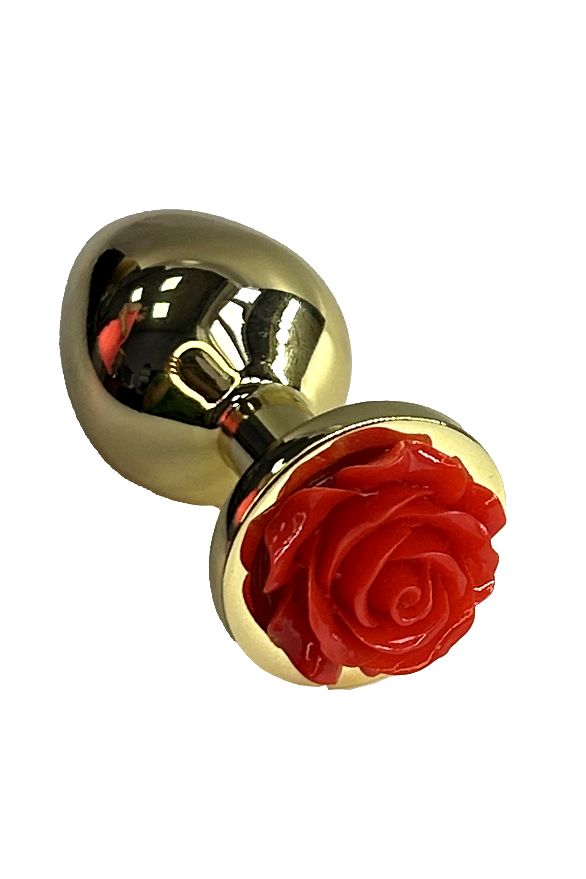 Kanikule - Золотая анальная пробка с ограничителем в форме красной розы (Medium)
